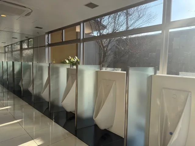 男性側の小用トイレからは、目の前に滝のようなものが見えます。