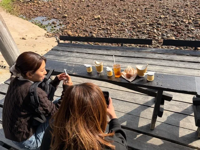 海を眺めながら、美味しいプリンと珈琲で楽しいひと時を過ごしております。