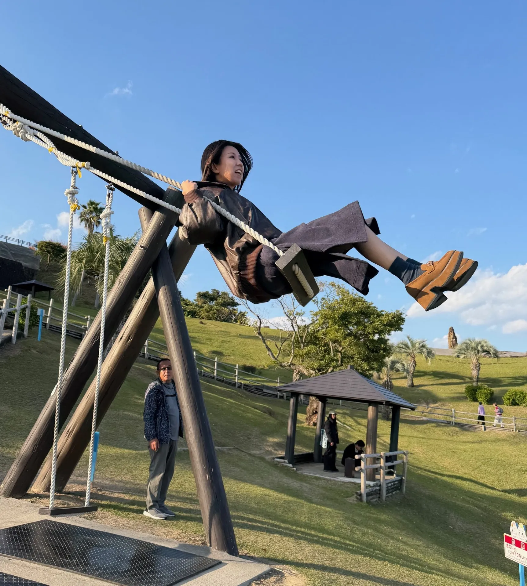 ここではブランコで思い切りこぎまくり、水平になりそうなところまでにしてしまい、